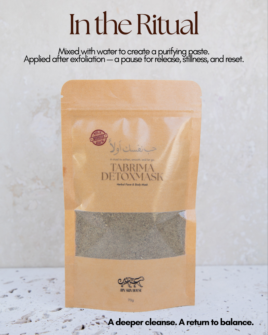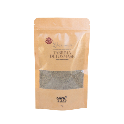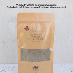 In a small bowl, mix Tabrima Detox Mask with Rosewater (recommended) to create a smooth, spreadable paste. Warm water may also be used if Rosewater is unavailable.